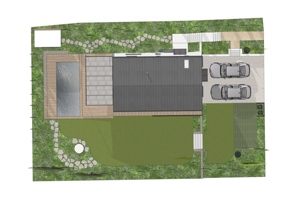 Rodinný dům na okraji Prokopského údolí stojí ve svahu jako poslední v řadě, a využívá tak nerušený výhled do okolního lesoparku. Jednoduchá hmota se sedlovou střechou a bílou fasádou doplňuje dřevěná okna a rozlehlá terasa, která obíhá jižní a západní stranu domu. Kompaktní půdorys respektuje omezenou plochu zastavění, přesto nabízí pohodlné zázemí pro čtyřčlennou rodinu. Hlavní obytný prostor je otevřen velkými okny do zahrady a přímo navazuje na krytou terasu, jež funguje jako prodloužení denní zóny. Využití svahu umožnilo umístit parkování a garáž do spodní úrovně a zachovat klidnější obytnou část výše v zahradě.